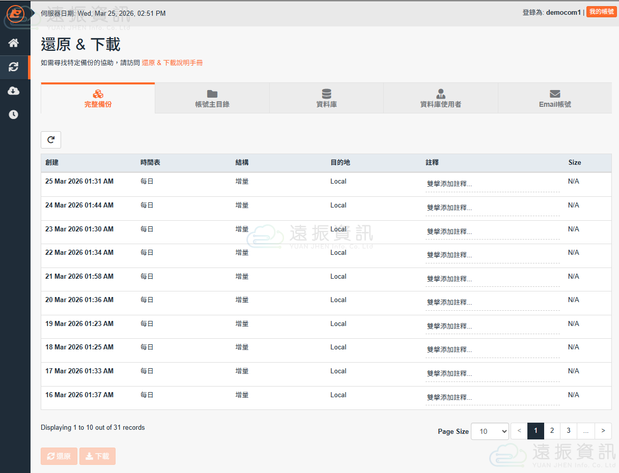 - 完成備份:可將整個帳號完整還原或下載完整備份檔案。