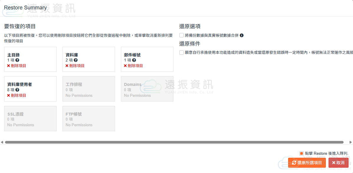 在進行還原操作前,系統會統整本次還原的項目,再還原前請務必再次確認。
